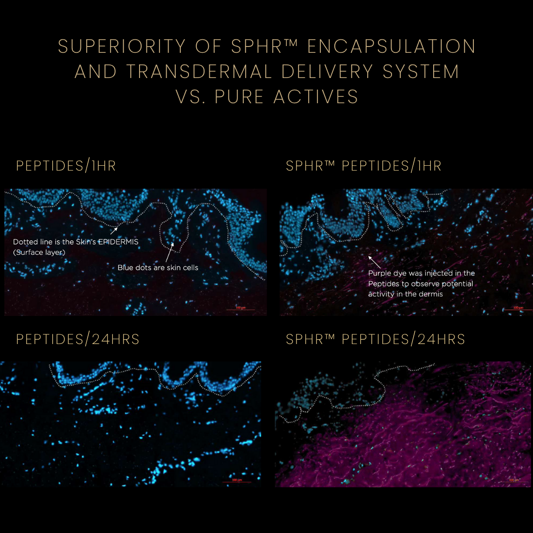 Enhanced with SPHR™️ proprietary encapsulation and transdermal delivery system technology to enable the release of peptide slowly over time, allowing active interaction with collagen and elastin in the skin dermis for up to 24 hours.